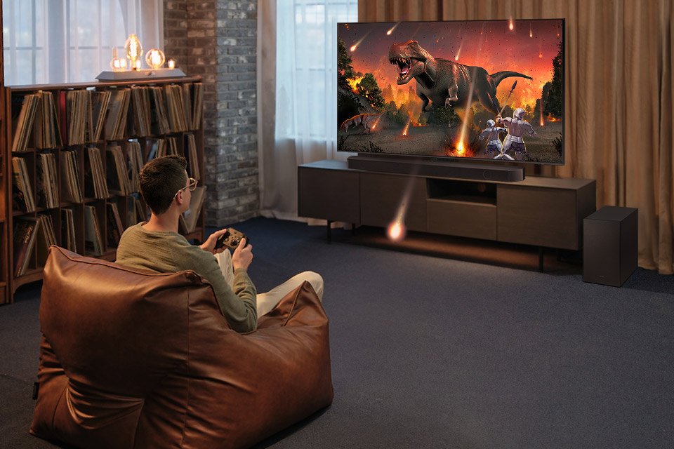Насолоджуйтесь звуком, ідеально оптимізованим для консольних ігор із потужними динаміками, спрямованими вгору, технологією Samsung Acoustic Beam і потужними басами. Крім того, звукова панель автоматично синхронізується з телевізором і вмикає професійний ігровий режим відразу після ввімкнення консолі.