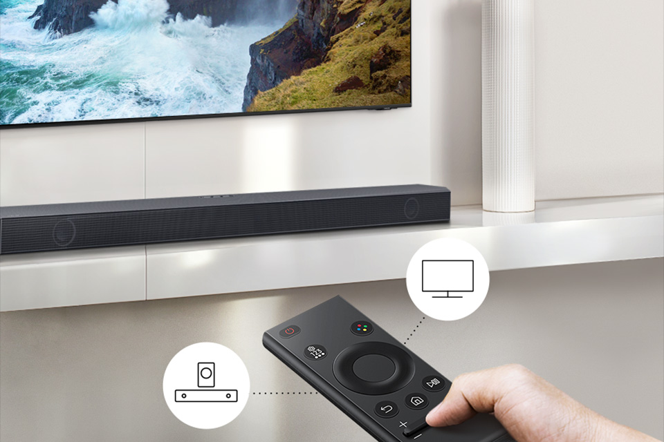 Забудьте про кілька пультів дистанційного керування. Тепер ви можете керувати функціями звукової панелі, регулювати гучність, умикати й вимикати звукову панель і керувати звуковими ефектами за допомогою One Remote Control — того самого, який ви використовуєте для керування телевізором Samsung.