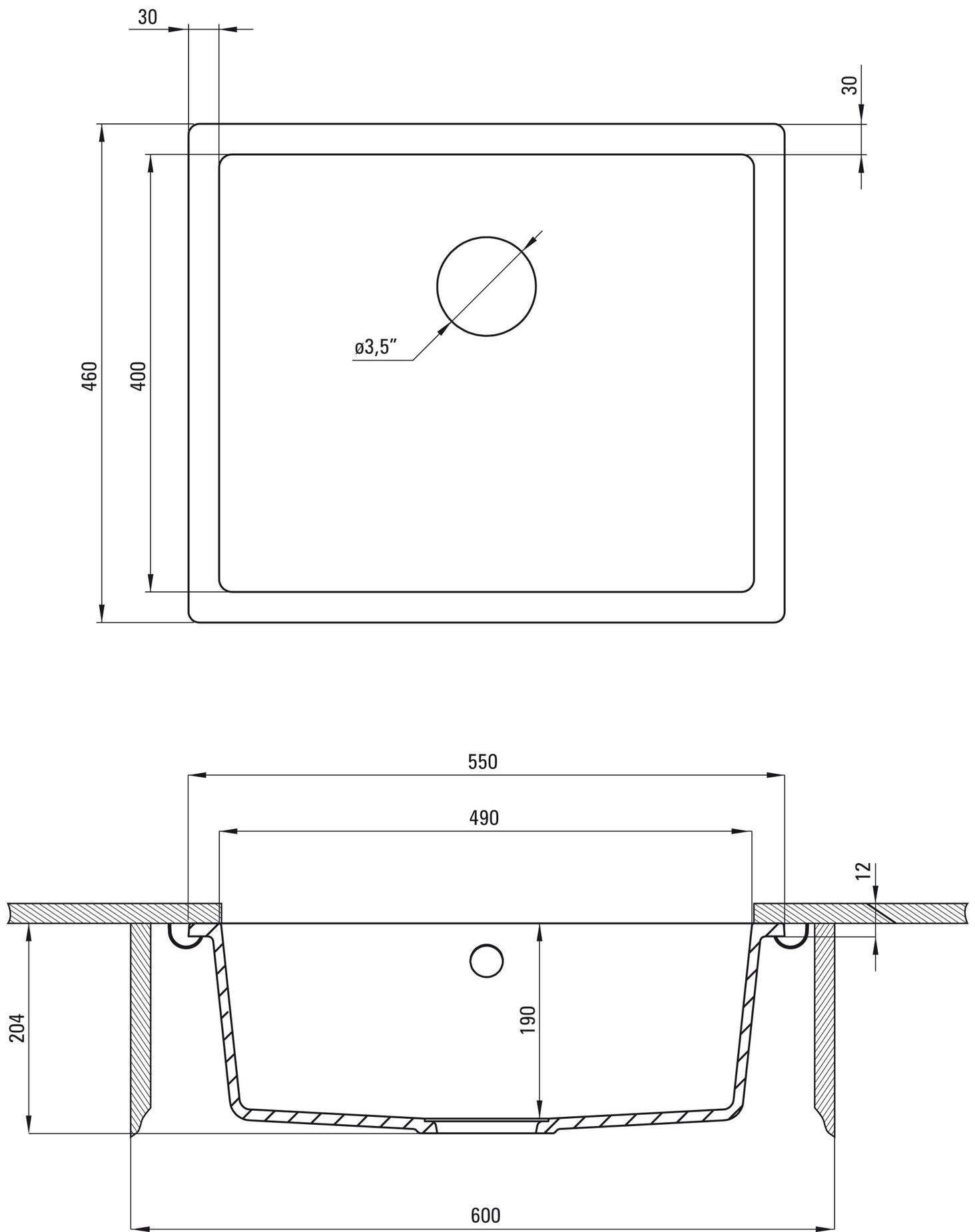 Довжина: 550 мм. Ширина: 460 мм. Глибина чаші: 190 мм. Для шафи: 600 мм. Модель раковини: 1 чаша. Злив: 3,5 дюйма