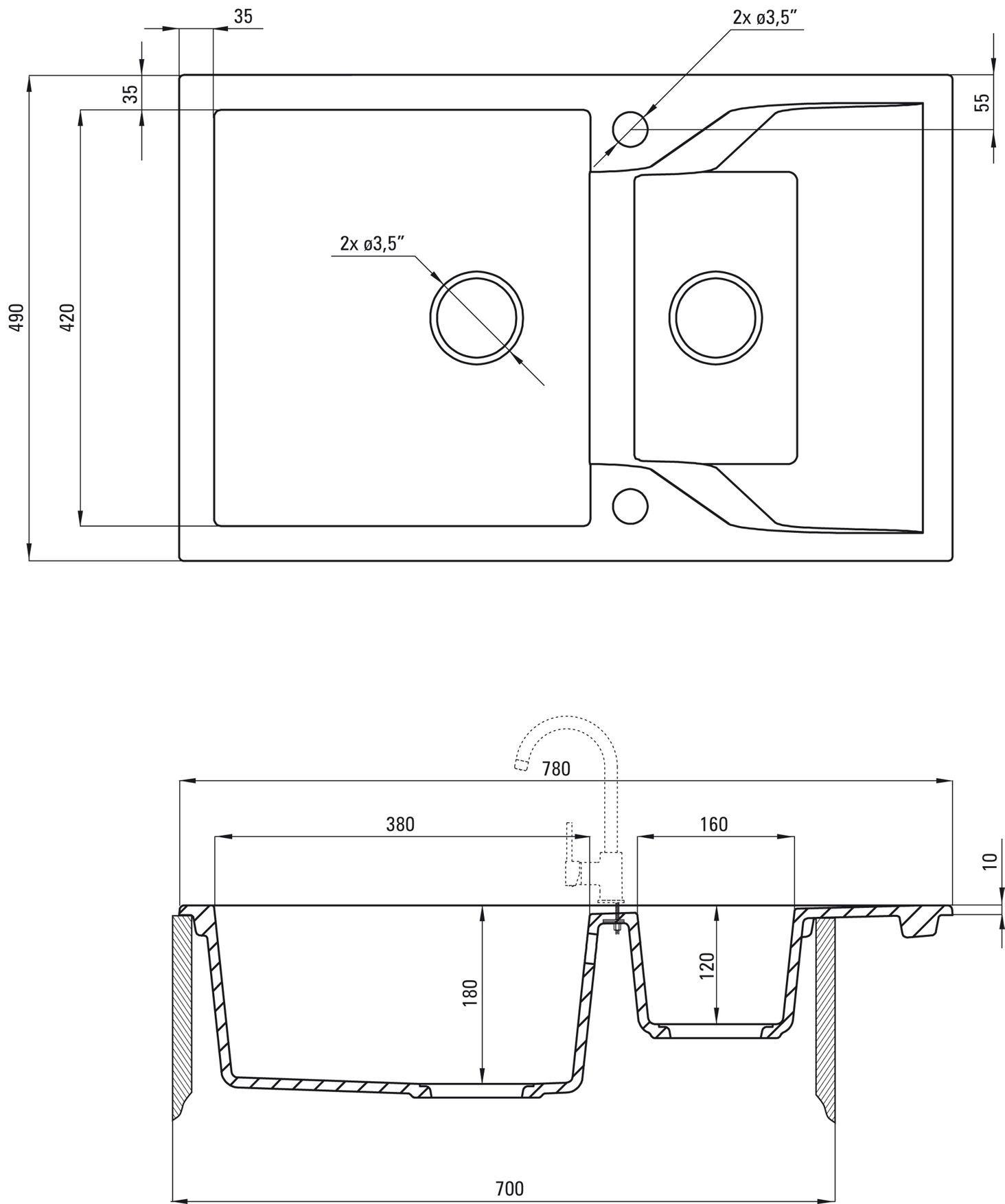 Довжина: 780 мм. Ширина: 490 мм. Глибина: 180 мм. Для шафи: 700 мм. Злив: 3,5 дюйма. Модель мийки: 1,5 чаші. Автоматична заглушка: Так