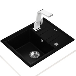 Абсолютний чорний, підкреслений матовою поверхнею раковини. Глибина кольору, в якій можна загубитися, додасть пишності сучасній елегантній кухні.