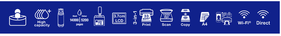 БАГАТОФУНКЦІОНАЛЬНИЙ ПРИНТЕР Двосторонній друк, РК-дисплей і система безперервної подачі чорнила ДУЖЕ НИЗЬКА ВАРТІСТЬ ДРУКУ, ви можете заощадити до 90%. ВЕЛИКИЙ ЗАПАС ЧОРНИЛА В КОМПЛЕКТІ Достатньо на 3 роки, 5200 сторінок у кольорі та 14 000 сторінок у чорно-білий.