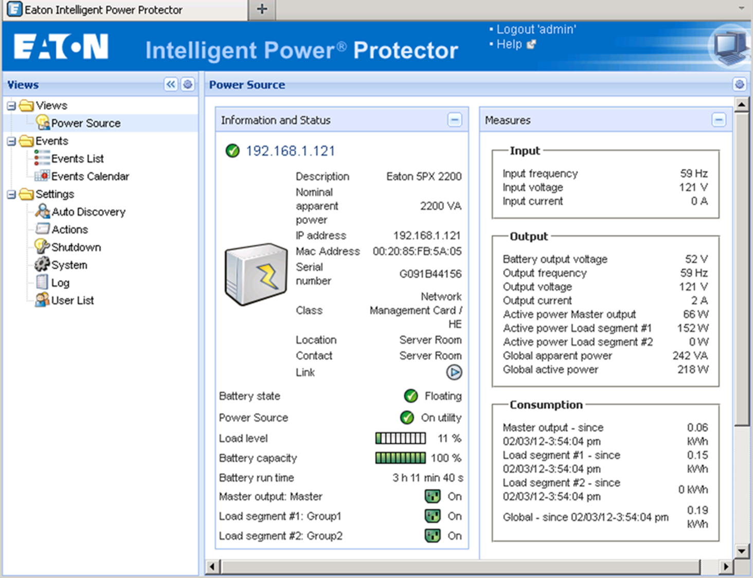 ДБЖ 5PX2200iRT3UG2 забезпечує ефективність до 99%, зменшуючи витрати на охолодження та електроенергію. Вихідні розетки IEC C13 поділяються на дві групи з вбудованою функцією вимірювання енергоспоживання. Значення кВт/год можна контролювати за допомогою РК-дисплея або програмного пакета Eaton Intelligent Power®. Контроль сегмента розетки дозволяє впорядковано вимикати менш чутливі пристрої, максимізуючи час роботи критичних пристроїв. Його також можна використовувати для віддаленого повторного вимкнення або перезапуску заблокованих приймальних пристроїв відповідно до вибраного розкладу.