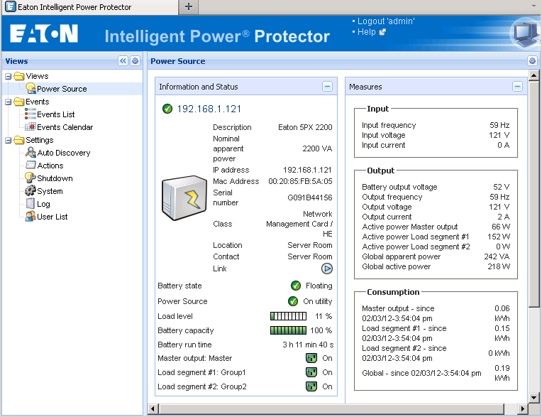 ДБЖ 9PX2200iRT2U розроблено з топологією подвійного перетворення в режимі онлайн, що дозволяє безперервно контролювати стан живлення. Вихідні розетки IEC C13 поділяються на дві групи з вбудованою функцією вимірювання енергоспоживання. Значення кВт/год можна контролювати за допомогою РК-дисплея або програмного пакета Eaton Intelligent Power®. Контроль сегмента розетки дозволяє впорядковано вимикати менш чутливі пристрої, максимізуючи час роботи критичних пристроїв. Його також можна використовувати для віддаленого повторного вимкнення або перезапуску заблокованих приймальних пристроїв відповідно до вибраного розкладу.