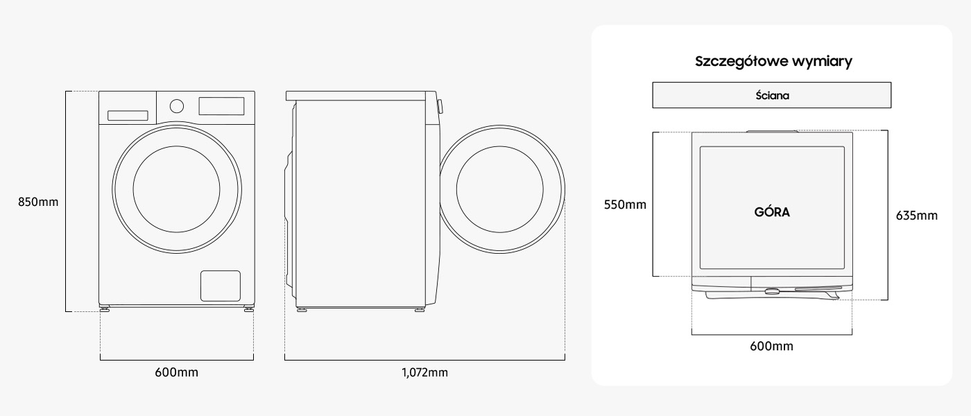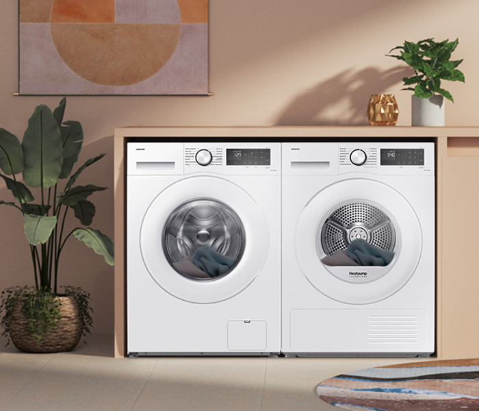 Для найкращих результатів прання та сушіння оберіть два пристрої Samsung з однієї серії. Вони відповідають один одному візуально і технічно. Ви можете розташувати їх як завгодно: пральна машина і сушильна машина поруч або в колоні, один прилад на іншому. Якщо ви хочете заощадити місце, розмістіть сушильну машину на пральній машині за допомогою роз’єму SKK-5EW.