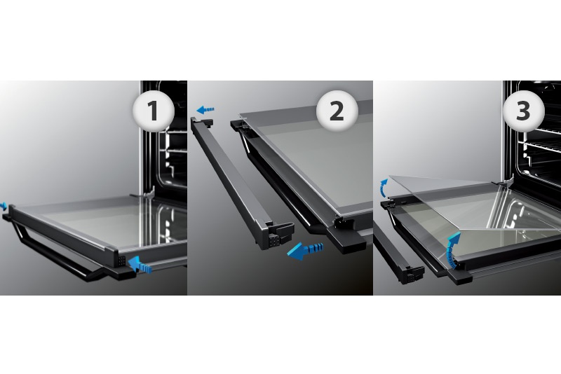 Знімні скляні дверцята дозволяють ретельно мити навіть у посудомийній машині. Лише три кроки: 1) Натисніть на фіксатори, розташовані у верхніх кутах дверцят 2) Зніміть верхню частину дверцят 3) Зніміть внутрішнє скло для очищення