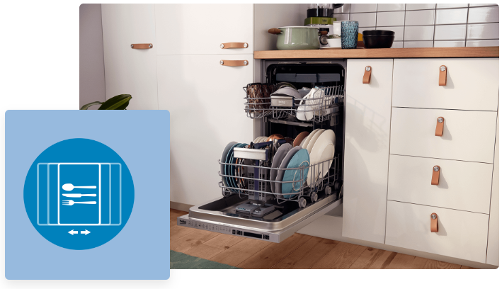 Останнє, що вам захочеться робити після зустрічі з друзями чи родиною, — це мити високі склянки та склянки вручну. На щастя, функція FlexiDrawer дозволяє встановити шухляду для столових приборів у 5 різних положеннях залежно від місця, необхідного у верхньому кошику. Тепер ви можете мити склянки з дуже довгою ніжкою в посудомийній машині!