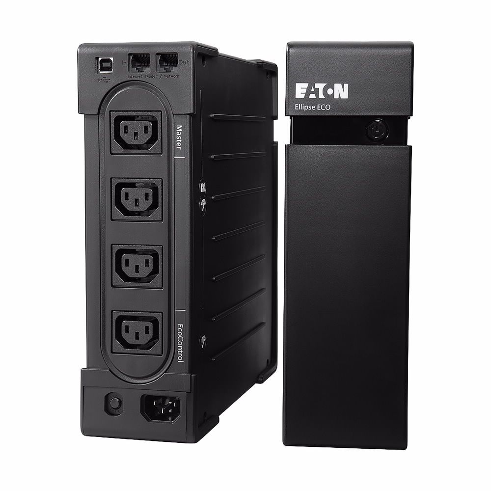 Eaton EL1200USBIEC має вісім вихідних розеток IEC-320-C13. Чотири розетки забезпечують резервне живлення від акумулятора із захистом від перенапруги. Додаткові розетки мають захист від перенапруги, а дві з них управляються функцією EcoControl. Після збою живлення ці розетки відключаються, а підключені до них пристрої автоматично вимикаються. Це заощадить енергію та дозволить ДБЖ працювати довше при роботі від батареї. Джерело живлення також забезпечує захист від стрибків напруги для IT-лінії (Інтернет/телефон/факс) завдяки вбудованим розеткам RJ45. Пристрій має можливість відключення кабелю живлення, що дозволяє використовувати кабелі різної довжини. Тут використовується типовий комп’ютерний кабель живлення IEC C13.