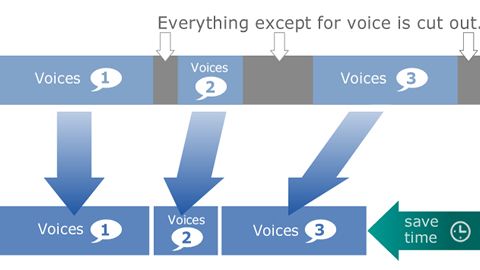 За допомогою функції відтворення голосу ви можете пропускати тишу в записі та відтворювати лише ті, які містять мову. Це підвищує ефективність транскрипції. Наприклад, якщо 70% записаного файлу містить мову, то годинний запис можна прослухати приблизно за 40 хвилин. Закінчивши запис, скористайтеся функцією відтворення голосу, щоб заощадити час і підвищити ефективність транскрипції.