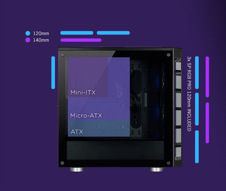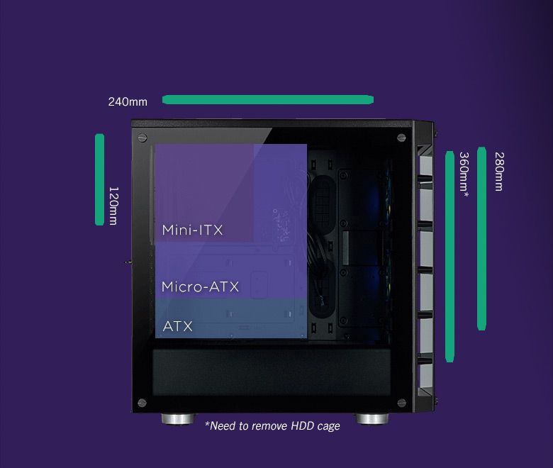 FANSВміщує до 6 вентиляторів 120 мм або кілька радіаторів розміром до 360 мм.