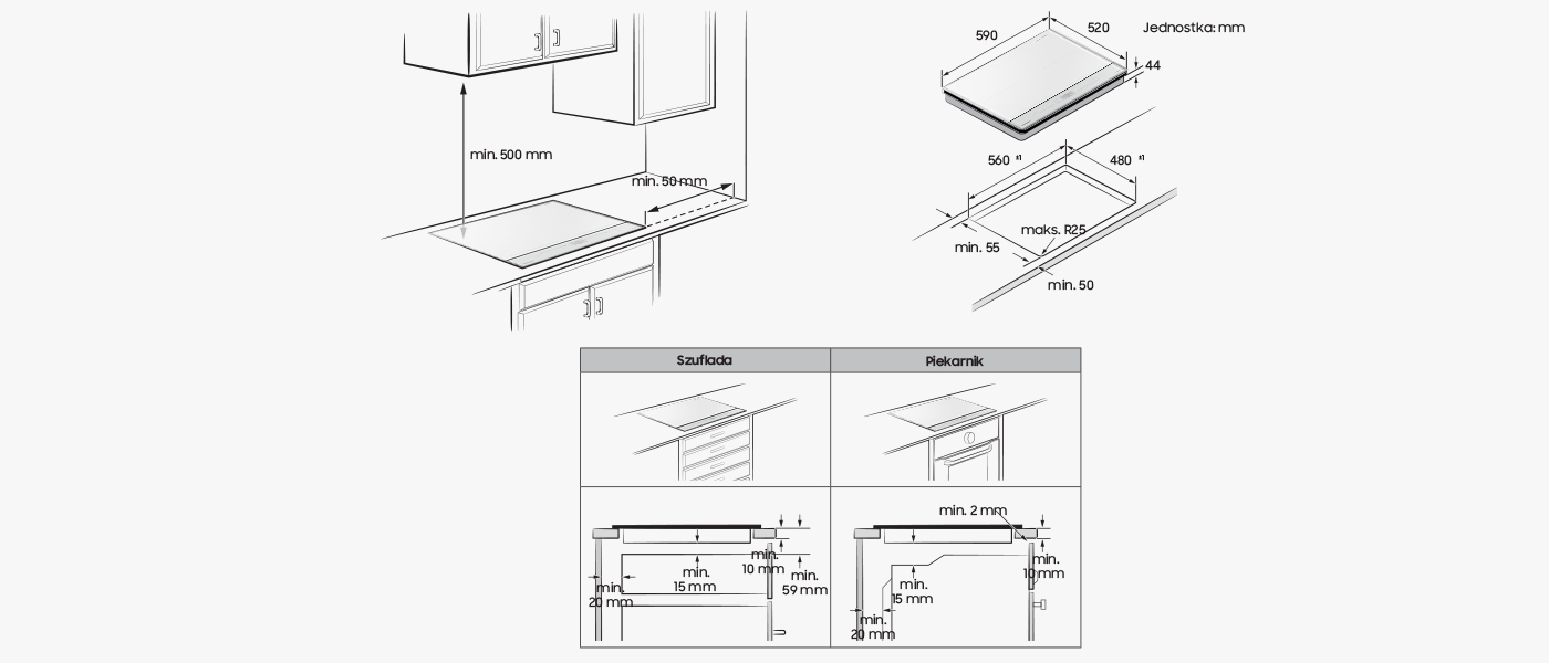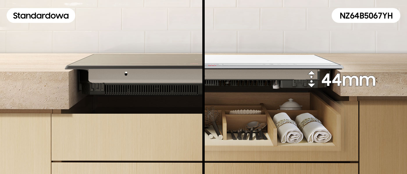Розроблена нами індукційна плита тонша. Його структуру було зменшено з 52 до 44 мм, тому його можна встановлювати в різні стільниці, навіть мінімальна товщина 10 мм. Таким чином, на вашій кухні буде більше місця для більшої шухляди. Це рішення, яке покращує монтаж, скорочує час і витрати на монтаж.