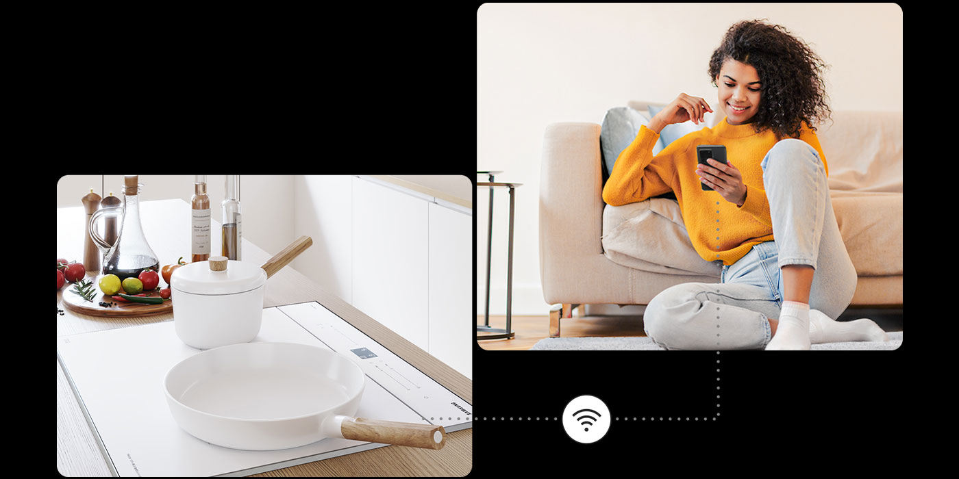 ** При підключенні до модуля Wi-Fi, розташованого в індукційній плиті, доступний лише моніторинг. Варильну панель не можна вмикати/вимикати за допомогою смартфона. Доступно на пристроях Android та iOS. (Android 6.0 і вище, iOS 10.0 і вище). Потрібне з’єднання Wi-Fi і обліковий запис Samsung.