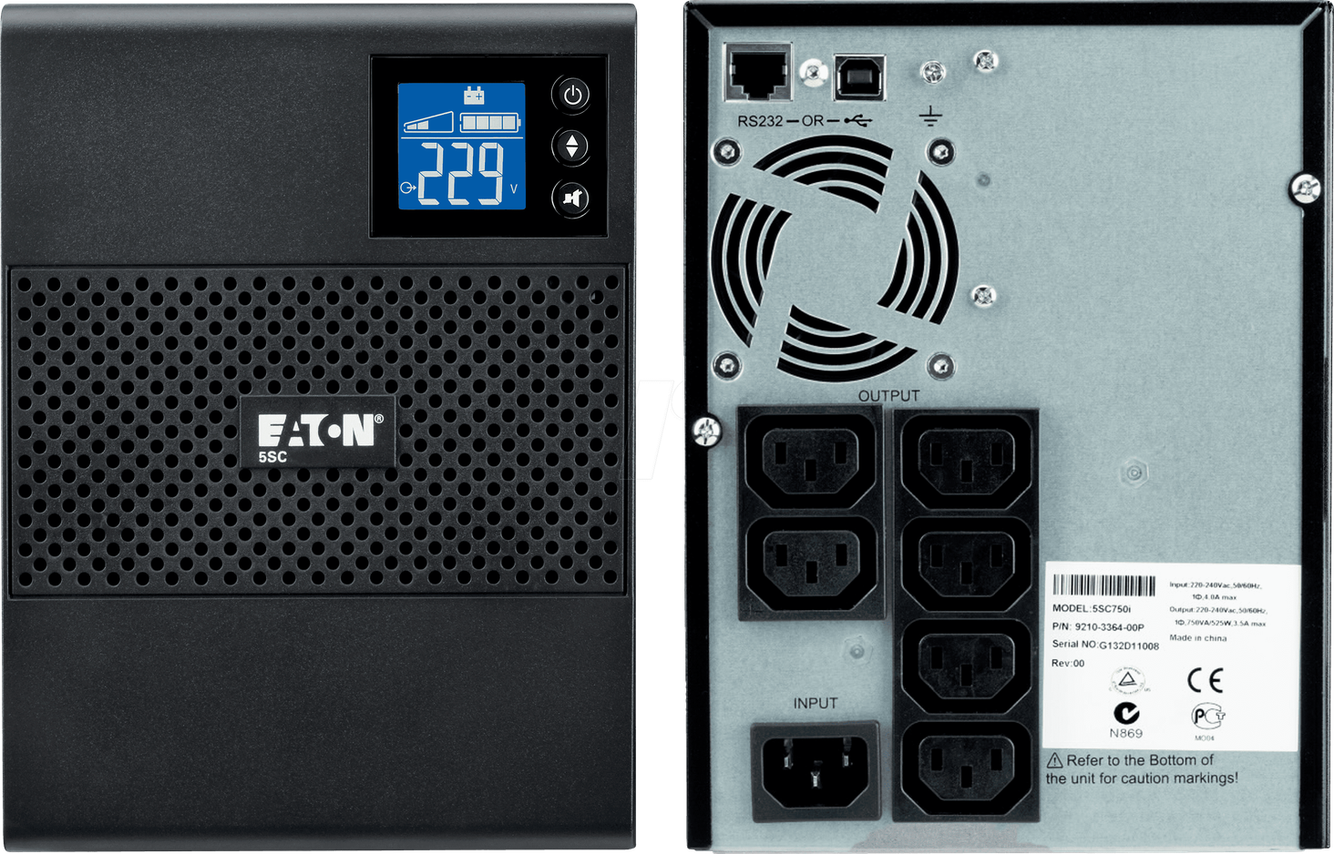 Eaton 5SC750i має шість вихідних розеток IEC C13, які забезпечують резервне живлення від акумулятора із захистом від перенапруги. Пристрій має можливість відключення кабелю живлення, що дозволяє використовувати кабелі різної довжини. Тут використовується типовий комп’ютерний кабель живлення IEC C13.