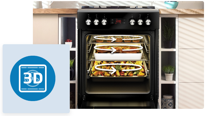 3D-випічка — це нове покоління випікання, яке активує всі нагрівальні елементи, наявні в даній моделі, і працює багатовимірно. Нагрівачі духовки працюють послідовно, щоб рівномірно розподілити тепло всередині. 3D-випічка також дозволяє випікати декілька страв одночасно.