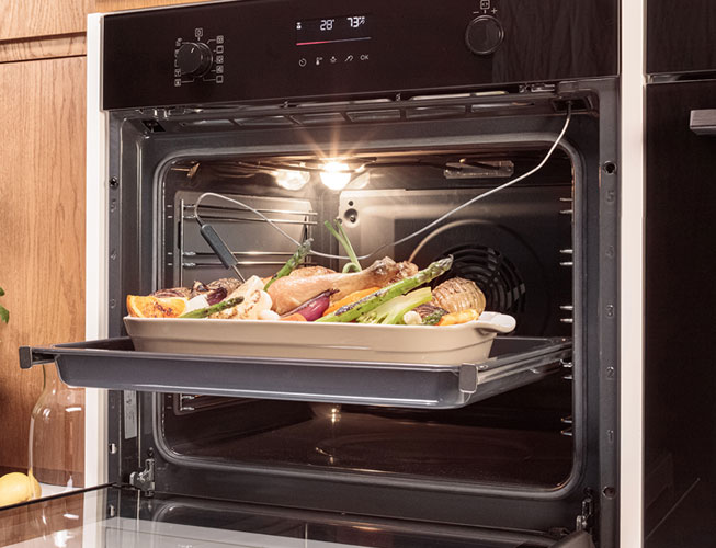 Духовка SenseCook® із термозондом контролює температуру всередині їжі. Коли страва буде готова, він подає сигнал про закінчення приготування та вимикає духовку.