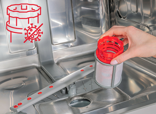 Фільтр зі спеціальним антибактеріальним покриттям усуває хвороботворні мікроорганізми та зменшує неприємні запахи з посудомийної машини.