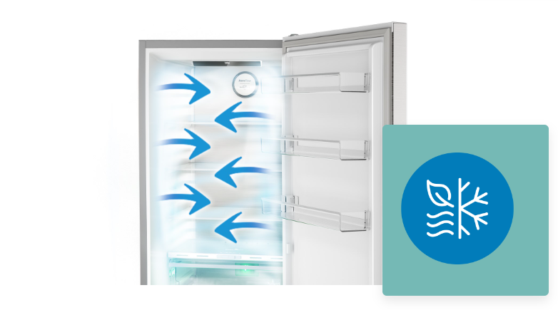 Інноваційна система охолодження No Frost - Beko AeroFlow. Холодне повітря рівномірно оточує продукти на всіх полицях холодильника, щоб вони довше залишалися свіжими та соковитими. М’яко розподіляючи повітря та мінімізуючи коливання температури, технологія AeroFlow™ дбайливо піклується про продукти в холодильнику