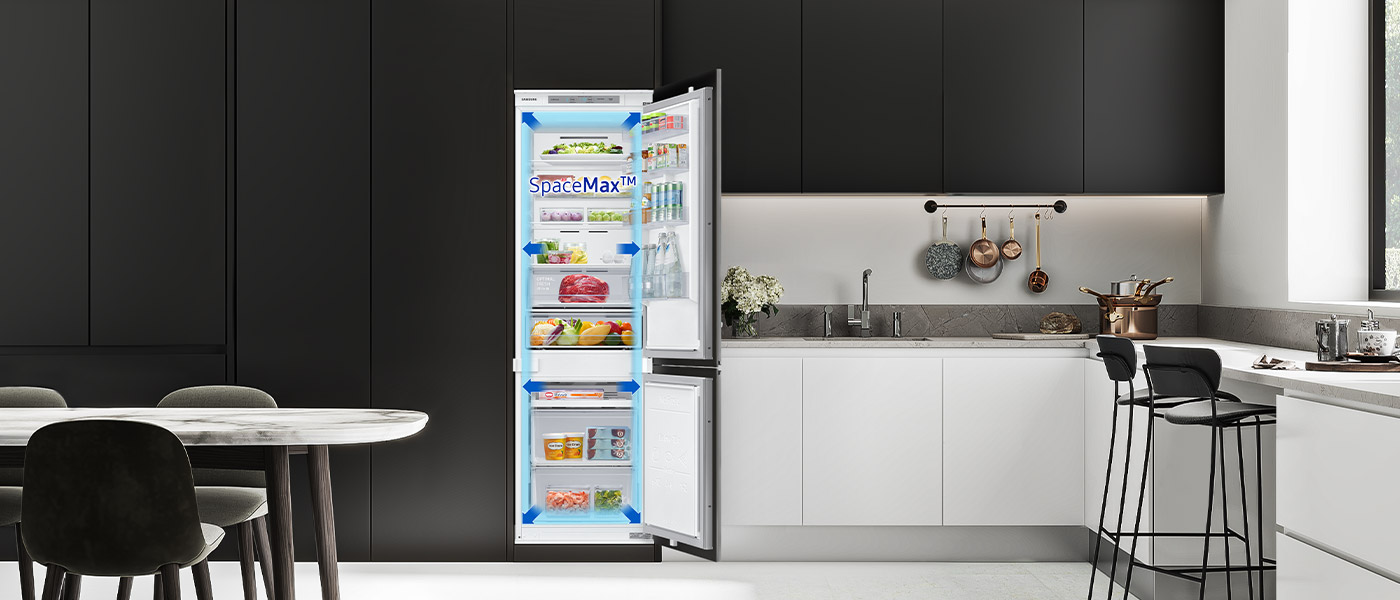 Вбудований холодильник Samsung має функціональні рішення, які спростять ваше щоденне використання. Ви можете легко помістити в нього великий посуд з їжею і високі пляшки або картонні коробки. Ви матимете вільний доступ до продуктів, а якщо ви забудете закрити дверцята, пристрій нагадає вам про це.