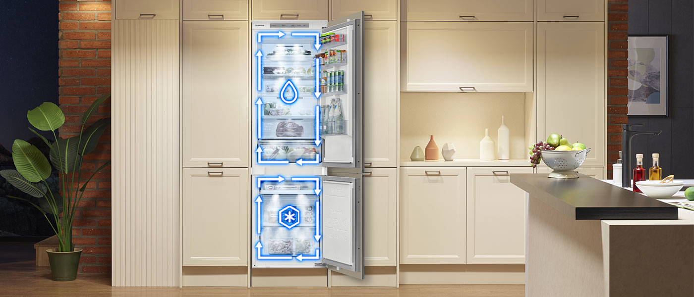 Дві незалежні системи циркуляції повітря з двома вентиляторами забезпечують належну температуру та вологість для продуктів, що зберігаються в холодильнику та морозильній камері. Завдяки цьому їжа не висихає, а ви довше можете насолоджуватися її свіжістю, природним смаком і ароматом.