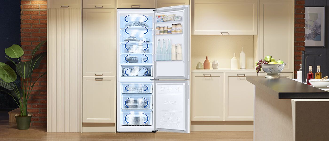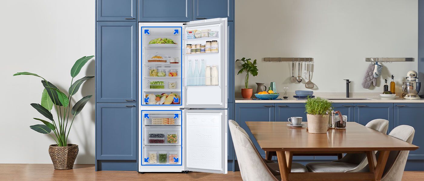 Система All-Around Cooling гарантує швидкий і м’який розподіл холодного повітря всередині холодильника. Завдяки цьому умови на кожній полиці однакові, а вибрати правильне місце для зберігання продуктів набагато легше.