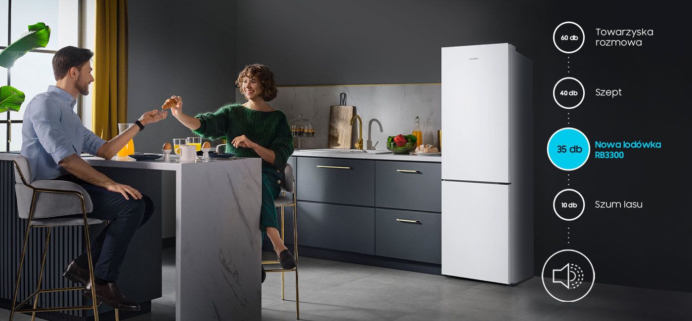 Відкрийте для себе новий вимір комфорту. Насолоджуйтесь улюбленими стравами та спілкуйтеся без зайвого шуму. Сучасні технології, застосовані в холодильнику-морозильнику Samsung, знижують шум і вібрацію пристрою. Завдяки цьому ви можете використовувати один із найтихіших холодильників на ринку - його рівень шуму досягає лише 35 дБ*.