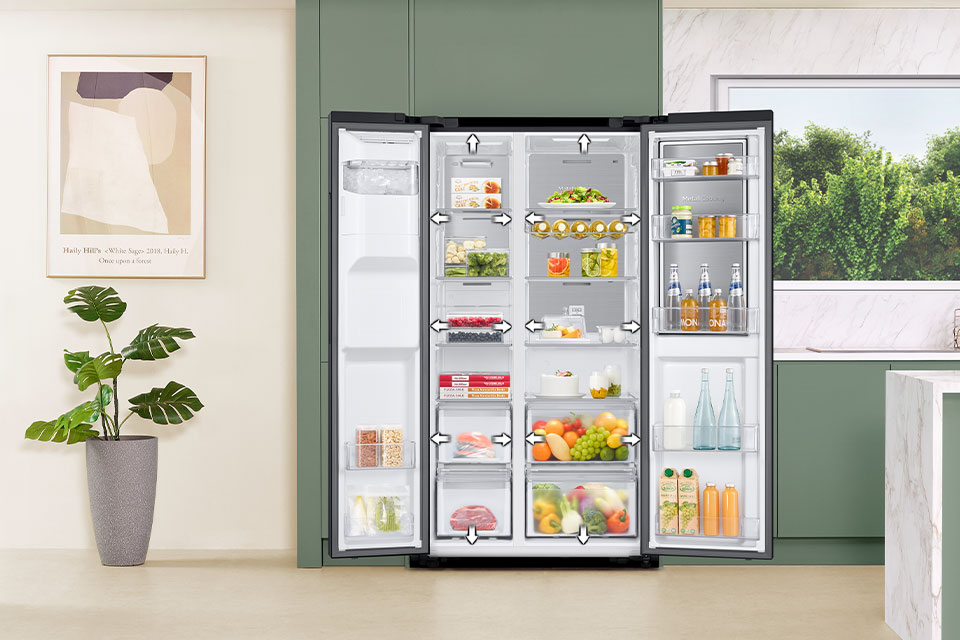 Система всестороннього охолодження обережно та рівномірно розподіляє прохолодне повітря по всьому пристрою. Завдяки цьому продукти в будь-якому місці холодильника швидко й ефективно охолоджуються, щоб залишатися свіжими якомога довше.