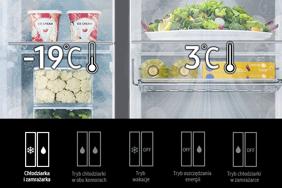 Функція Power Cool — це інтенсивне вдування холодного повітря в холодильник, що прискорює охолодження продуктів і напоїв на 32%³. Функція Power Freeze встановлює мінімальну температуру в морозилці та запускає інтенсивний обдув холодним повітрям. Завдяки цьому ви можете готувати кубики льоду або глибоко заморожувати продукти на 35% швидше³.