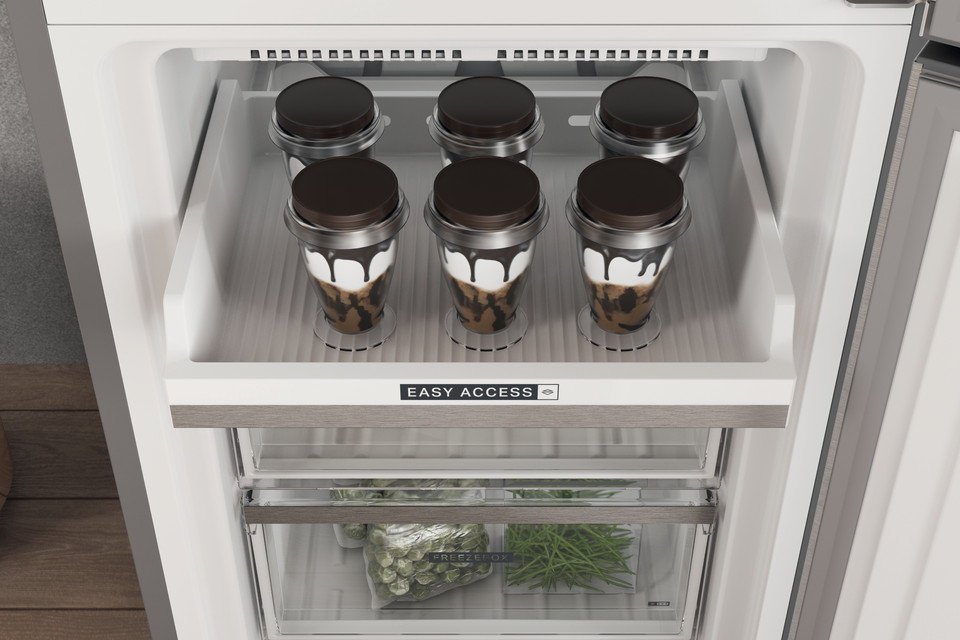 Завдяки 3 різним конфігураціям полиць Flexi Shelf+ ви можете регулювати простір у холодильнику відповідно до своїх потреб. • Складіть полицю навпіл, щоб зберігати високу пляшку чи глечик • Повністю складіть полицю, щоб помістити великі каструлі чи інші предмети невеликого розміру • Залиште її розкладеною для щоденного використання