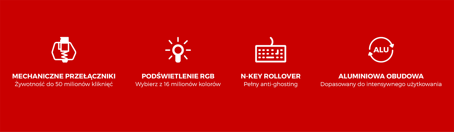 Thor 400 RGB оснащений топовими перемикачами Kailh RED, які відрізняються надзвичайно тихою роботою. Кнопки працюють лінійно, тому необхідно однакове натискання на всій відстані натискання клавіші. Майже непомітний хід клавіш і короткий хід активації роблять перемикачі ідеальними навіть для найвимогливіших ігор.