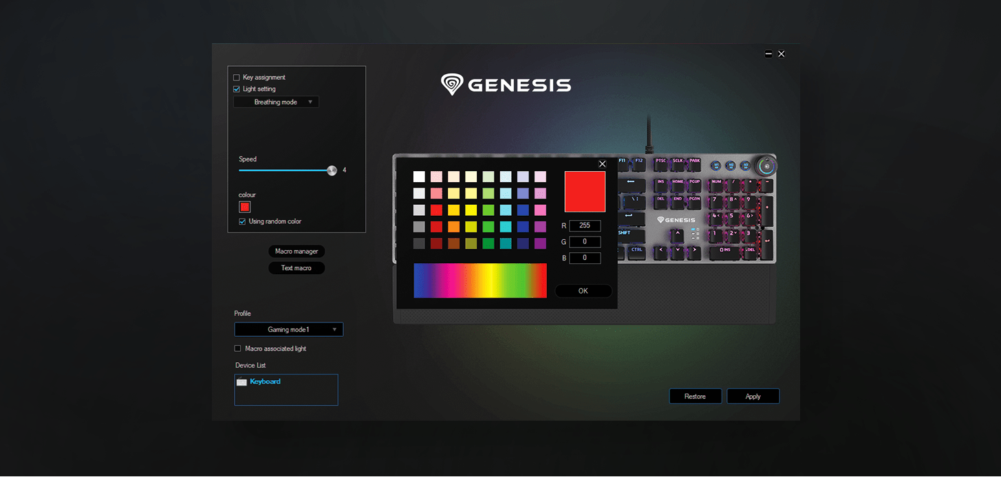 Thor 400 RGB працює зі спеціальним програмним забезпеченням, яке дозволяє повністю персоналізувати налаштування пристрою. Виберіть свій улюблений режим освітлення RGB, створюйте вбивчі комбо та налаштовуйте макроси та профілі. Візьміть під свій контроль клавіатуру та не дозволяйте суперникам вас здивувати!