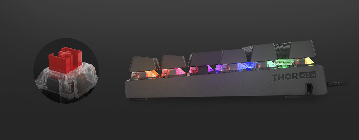 Прецизійні механічні перемикачі Outemu Red характеризуються швидким відгуком, дуже низькою точкою спрацьовування - 2 мм і необхідною силою натискання лише 45 г. Завдяки цьому ваш комп'ютер зафіксує дію набагато швидше, ніж у випадку з мембранними аналогами. З Thor 303 TKL ви завжди будете на крок попереду суперника.