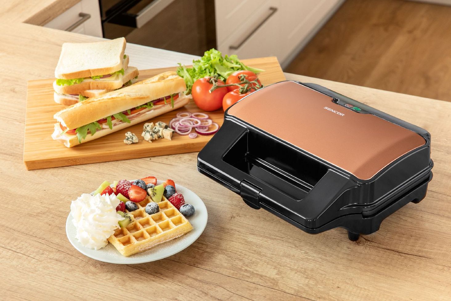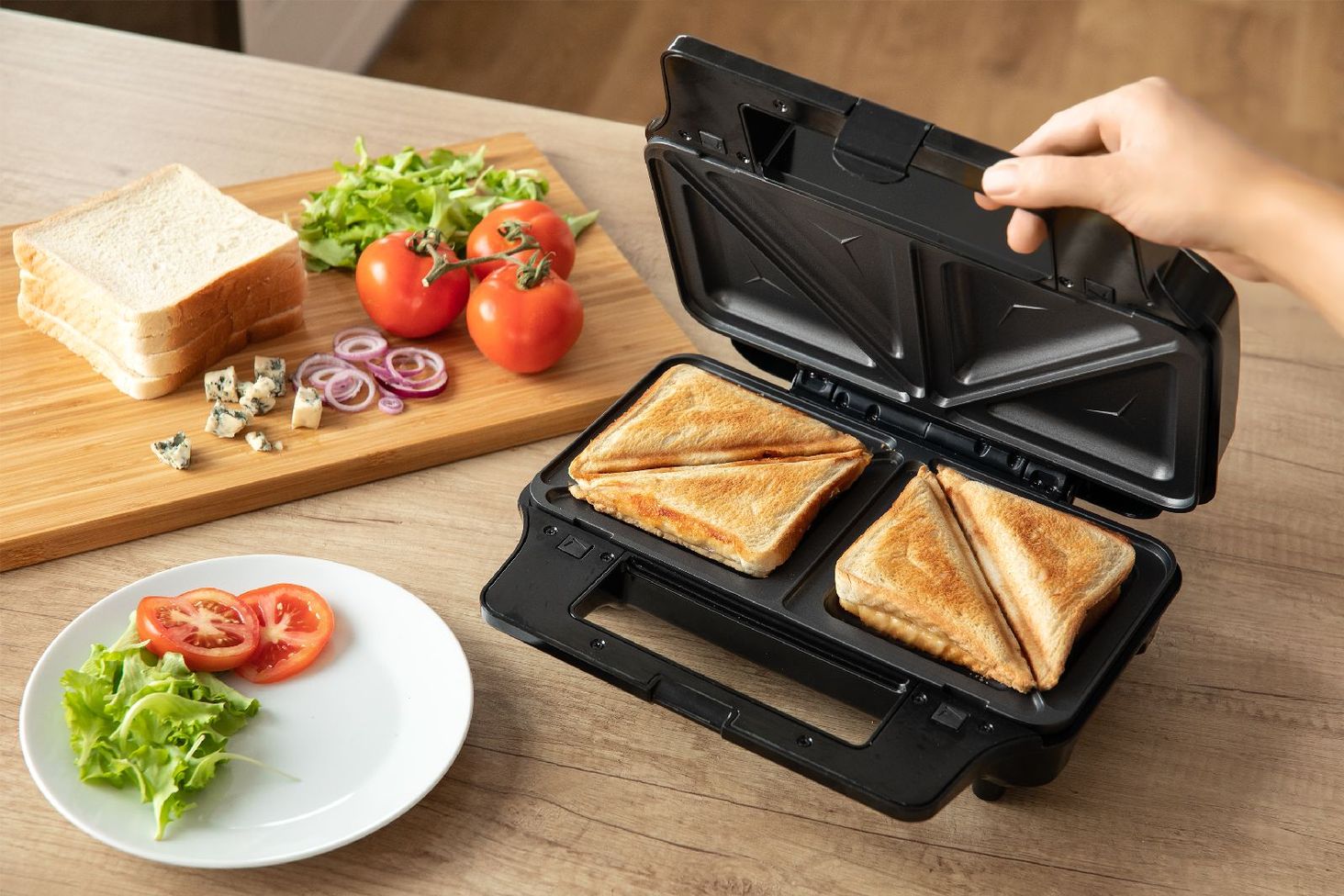 Легкий і смачний сніданок. Використовуйте чотири тарілки для різноманітних сендвічів, вафель і смаження м’яса. Тостер має потужність 900 Вт, що дозволяє швидко випікати, а антипригарне покриття пластин дозволяє легко мити. Керувати тостером легко і безпечно завдяки світловим індикаторам, які інформують про стан пристрою, а термоізольований корпус і ручка запобігають опікам.