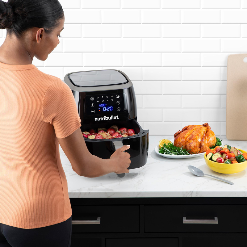 Здорове приготування їжі не означає відмову від смаку, зручності чи економії часу. З цифровою фритюрницею Nutribullet XXL ви можете готувати улюблені страви та ароматні закуски швидше, ніж раніше, і з меншою кількістю жиру - заради здорового харчування всієї родини._x000D_ Цей багатофункціональний пристрій, оснащений місткою 7-літровою чашею і потужністю 1800 Вт, дозволяє запікати, смажити і навіть сушити, наприклад, фрукти і гриби, щоб зберегти їх смак і поживну цінність поза сезоном. Конвекція 360° забезпечує ефективну роботу та рівномірну температуру всередині чаші для отримання ідеальної консистенції страв та скорочення часу їх приготування. Насичений смаком, хрусткі пропозиції в більш здоровій версії? Тепер це можливо!