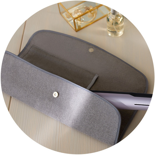 Випрямляч постачається зі згорнутим термостійким футляром, який полегшує зберігання та транспортування пристрою.