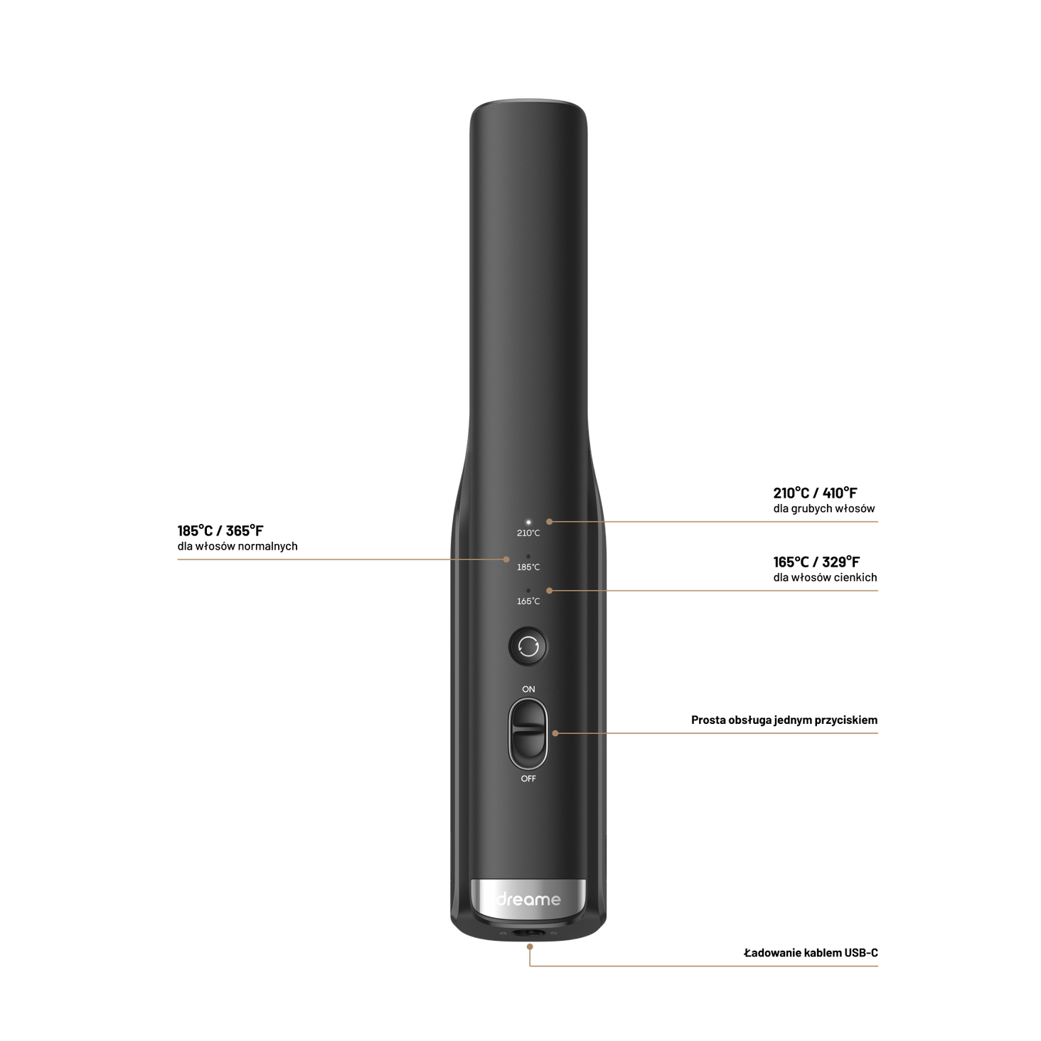 Dreame Glamour адаптується до ваших потреб, оскільки має 3-рівневий контроль температури. Для ніжного, тонкого або пошкодженого волосся виберіть режим Normal. Він підтримує температуру 165°. Однак, якщо у вас нормальне волосся або волосся середньої товщини, виберіть режим «Помірний» з температурою 185°. Забезпечує ідеальний баланс між ефективним випрямленням і захистом волосся. Режим Ultra і температура 210° призначені для густого, важкого або особливо кучерявого волосся. Все це означає, що незалежно від типу вашого волосся, Dreame Glamour виправдає ваші очікування.