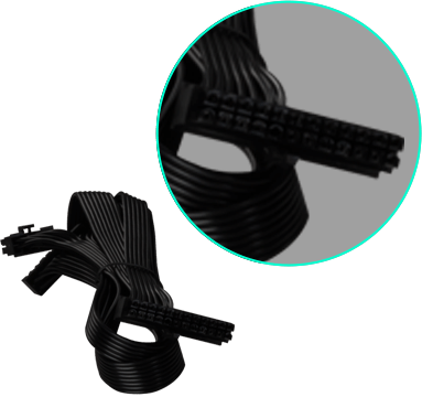 Усі кабелі, що входять до складу ігрових блоків живлення серії MPG, плоскі та чорні. Плоскі кабелі спрощують управління кабелем і не створюють головного болю для користувача! Завдяки плоским кабелям вся система може бути краще організована, і є більше простору для вільного потоку повітря. Використовуйте лише ті кабелі, які вам потрібні, а решту зберігайте в сумці для кабелів, що входить у комплект.