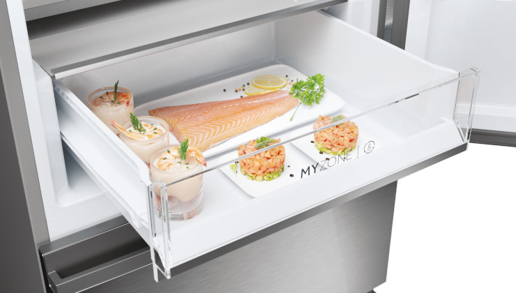 Ящик My Zone дозволяє легко регулювати температуру до оптимального рівня для їжі, що зберігається в ньому. Є три варіанти налаштування. Варіант для зберігання свіжих фруктів і овочів. Функція для м'яса або продуктів швидкого приготування, яка регулює температуру в ящику My Zone до 0°C. А також опція Q-Cool, яка дозволяє зберігати сир, свіжу пасту та молочні продукти при +2°C.