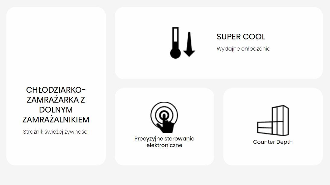 Ефективне охолодження. Функція super cool дозволяє швидко знизити внутрішню температуру та підтримує її в холодильній камері на рівні +2 ℃ протягом 6 годин. Це чудовий спосіб зберегти смак, колір і поживну цінність свіжих продуктів.
