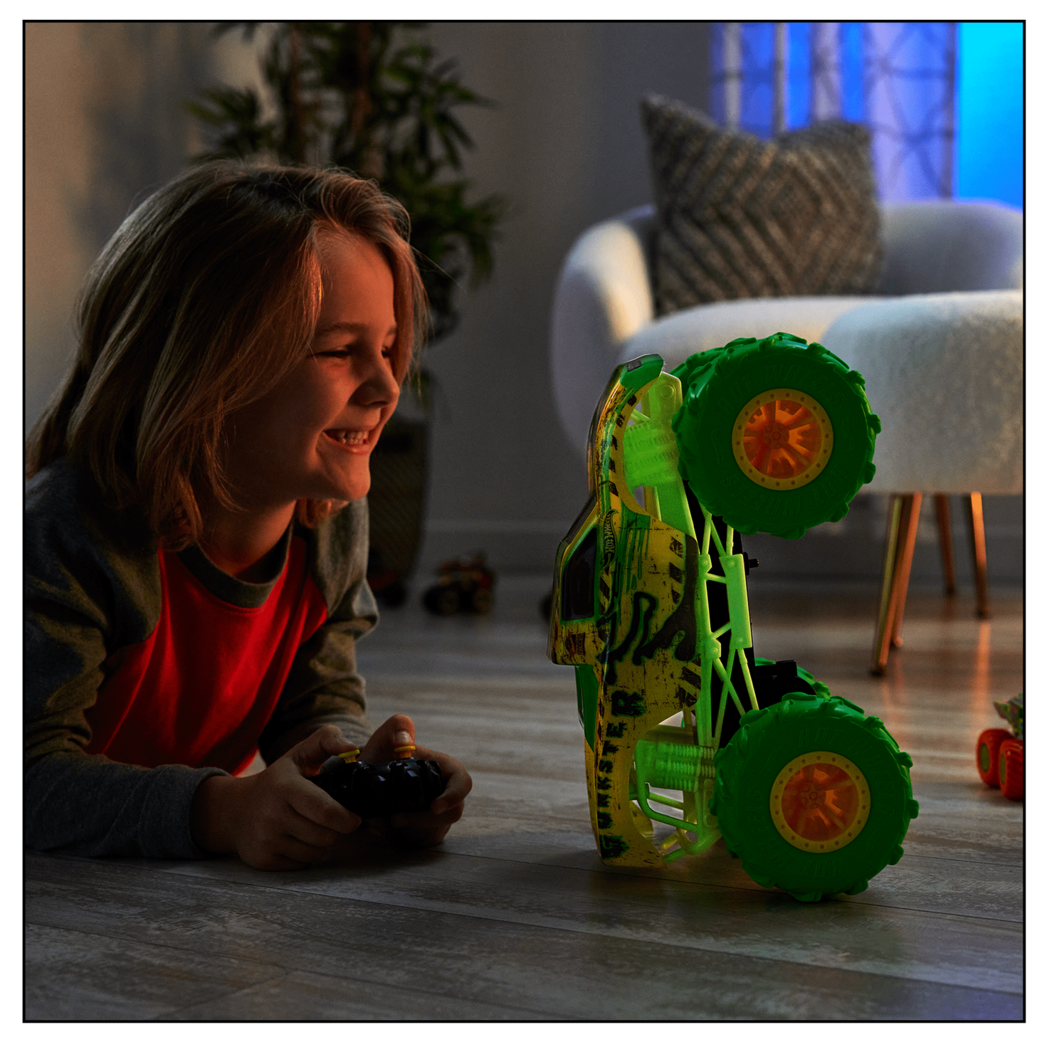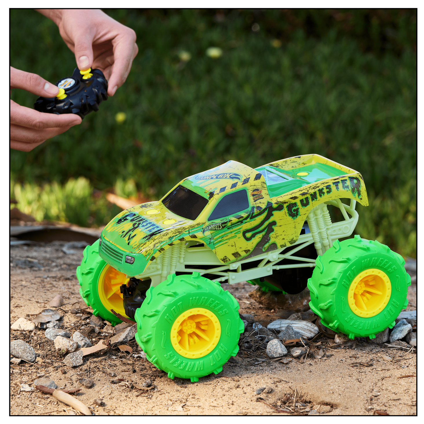 Біжіть назустріч великим пригодам як удень, так і в темряві з автомобілем на дистанційному керуванні Hot Wheels Monster Trucks™ Gunkster™ у масштабі 1:15.
