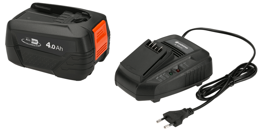 Набір складається з швидкозарядного пристрою GARDENA AL 1830 CV та акумулятора POWER FOR ALL ємністю 4,0 Аг.