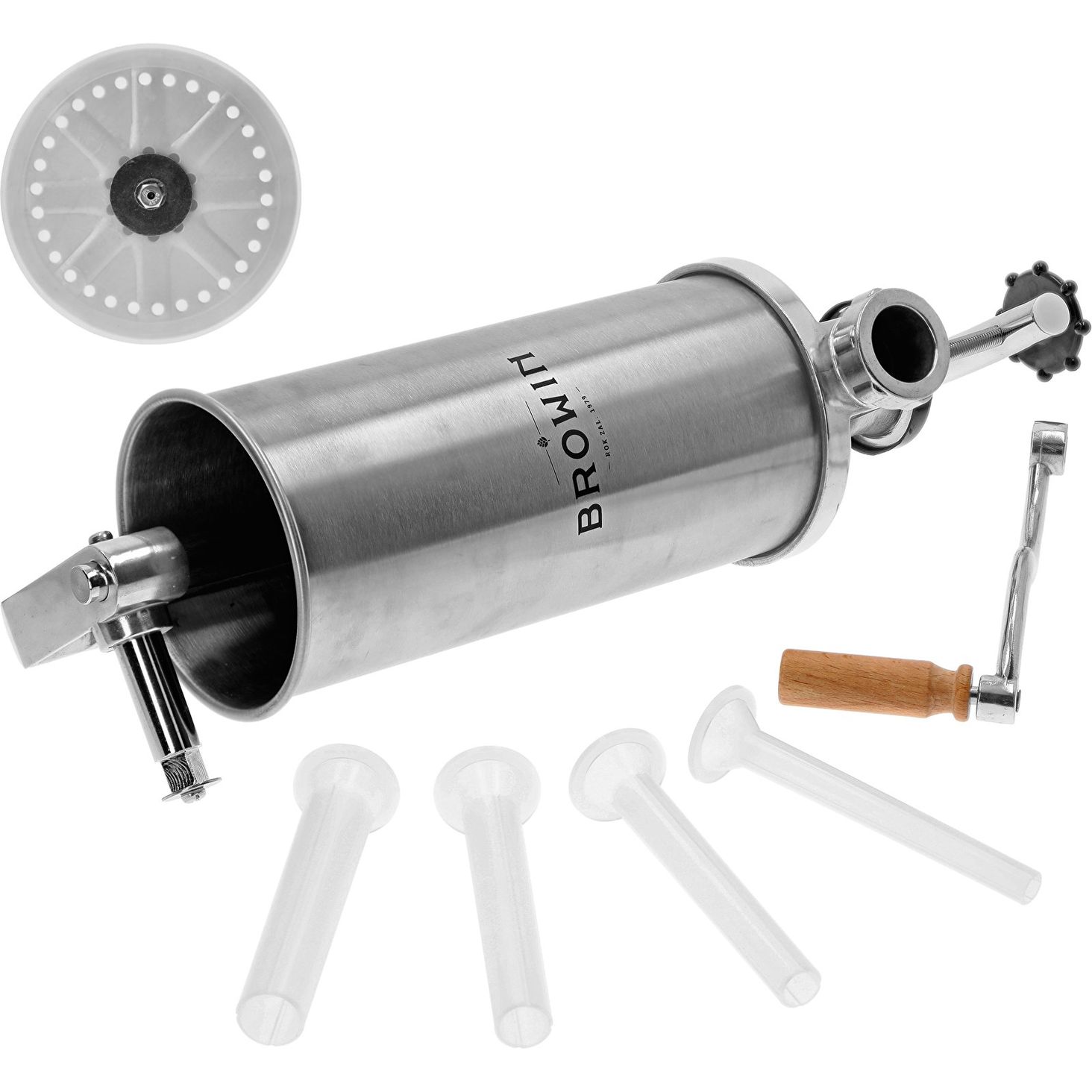 Мрієте про здорове, домашнє м'ясо без консервантів і непотрібних хімічних добавок? Наш вертикальний фарш - це незамінний пристрій, який неодмінно стане в нагоді при виготовленні домашніх ковбас, нарізок і страв з субпродуктів. Високоякісна нержавіюча сталь, з якої виготовлений циліндр сальника, а також продумана конструкція і спеціально розроблений стійкий до вигинів поршень роблять пристрій служити вам роками! Поршень додатково оснащений повітровідвідником, завдяки якому повітря виштовхується з-під поршня, а не проганяється в кишечник. У комплекті з нашою набивкою також є 4 воронки різного розміру, які дозволять вам виготовляти саморобки діаметром: 14 мм, 18 мм, 21 мм і 25 мм. Обираючи нашу начинку, ви отримуєте можливість готувати справді різноманітні страви! Наповнювач надзвичайно простий у використанні та обслуговуванні.