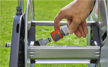 Протикрапельна насадка запобігає витіканню води після використання або під час переміщення візка для шланга.