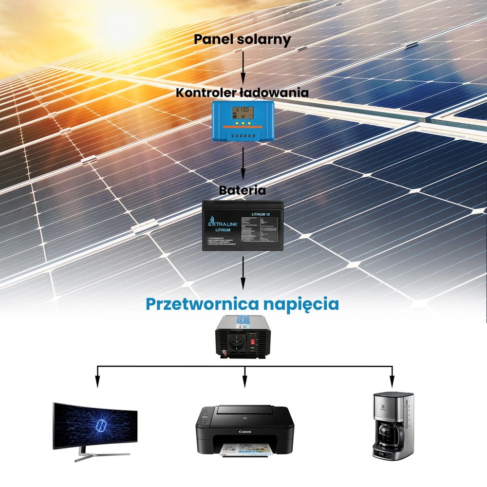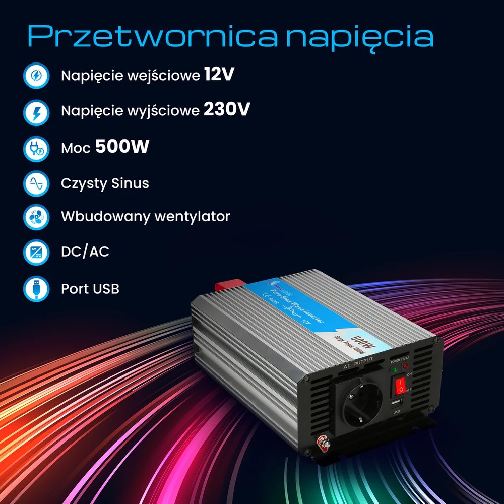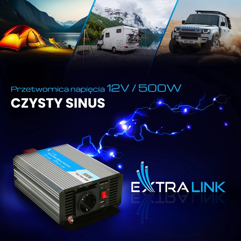 Extralink OPIP-500W — ідеальне рішення для людей, яким потрібно перетворити напругу батареї в мережевий струм змінного струму 230 В. Завдяки цьому вони зможуть живити стандартні побутові прилади, такі як телевізор, холодильник, радіо, освітлення, або заряджати свої електронні пристрої, такі як ноутбук чи мобільний телефон. Цей пристрій забезпечує чисту синусоїду, що робить струм стабільним і безпечним для підключених пристроїв.