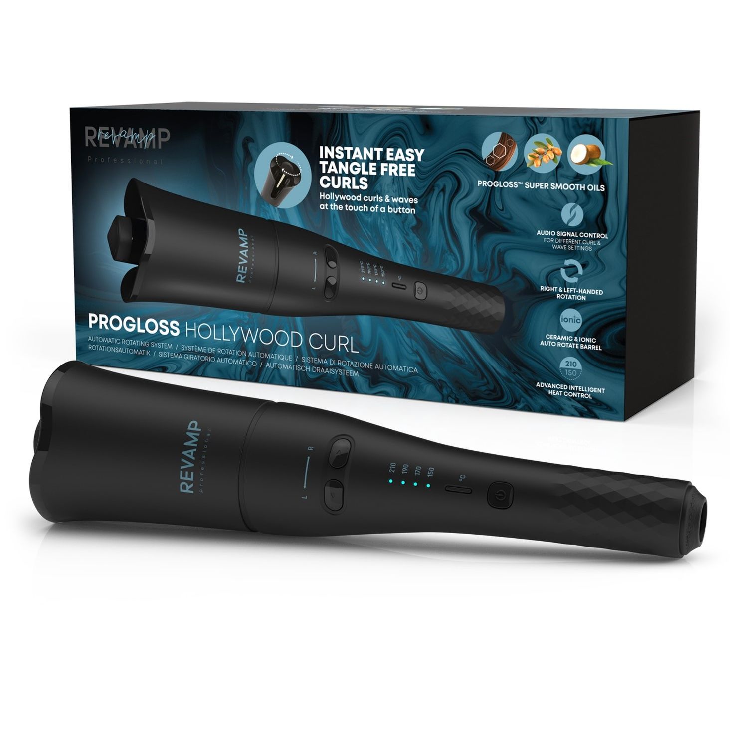 Позбудьтеся завивки волосся за допомогою автоматичної обертової праски Revamp Progloss Hollywood Curl. Наша унікальна плойка оснащена системою автоматичного обертання, яка дозволяє швидко та легко укладати. Одним натисканням кнопки ви можете створити чудові кучері та хвилі. Збагачений оліями Progloss для створення зачіски з винятковим блиском.