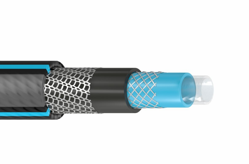 6-шаровий шланг, не скручується, стійкий до вузлів, що перекривають потік води, подвійне поперечне трикотажне обплетення ATS2™, внутрішній шар з матеріалу, придатного для контакту з їжею, стійкий до УФ-променів і відкладення водоростей всередині шланга, не містить кадмію, барію та свинцю, тиск розриву 30 бар, температурний діапазон умов експлуатації −20/+60°С відмінні експлуатаційні властивості довгострокова гарантія при належних умовах експлуатації