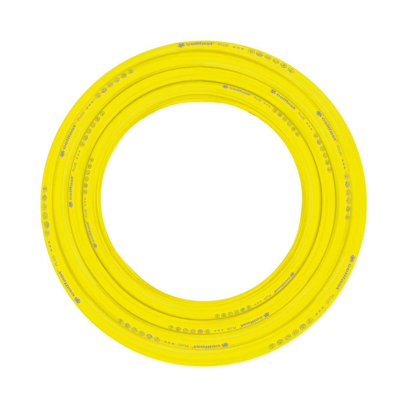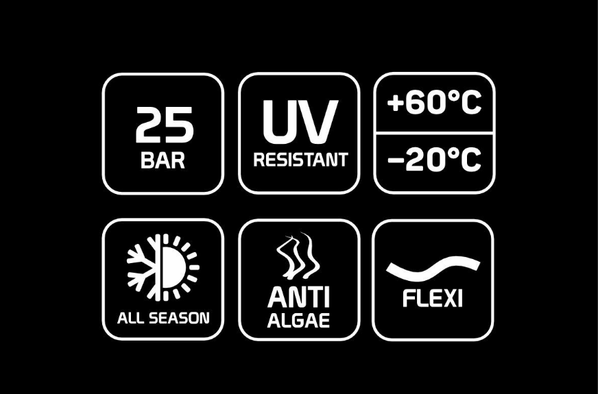 Садовий шланг PLUS, завдяки використанню високоякісних матеріалів, характеризується максимальною стійкістю до тиску води 25 бар, стійкістю до УФ-випромінювання та робочих температур від -20°C до +60°C, тому його можна використовувати в усі пори року. Він також відрізняється стійкістю до осідання всередині водоростей.