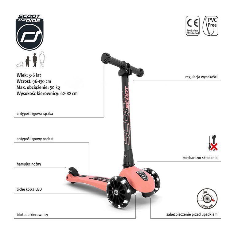Highwaykick 3 LED — це інноваційний триколісний самокат-балансир від австрійського бренду SCOOT&RIDE, оснащений світлодіодними колесами, які підсвічуються під час їзди. Ідеально підходить для активних дітей віком від 3 років (96 см) до 120 см, тобто до 7 років.
