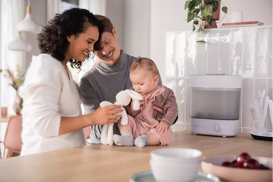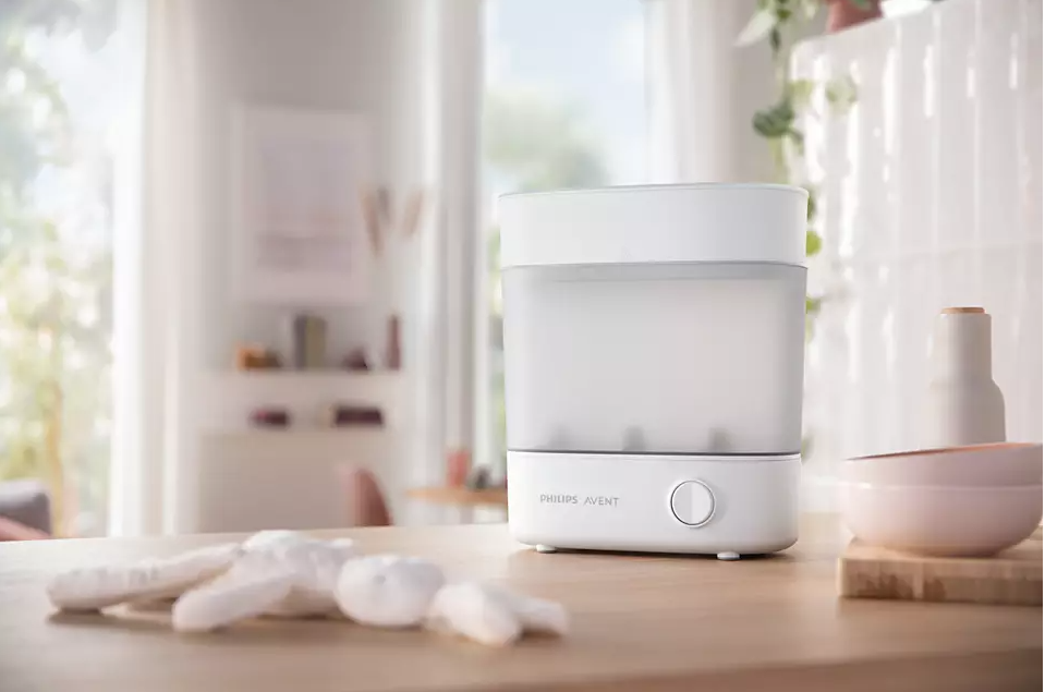 Стерилізація та зберігання Стерилізуйте до шести пляшечок для годування з аксесуарами лише за 10 хвилин. Тонкий, але місткий, вдосконалений стерилізатор для пляшок працює швидко та ефективно. Знищує 99,9% мікробів* для душевного спокою під час кожного годування.
