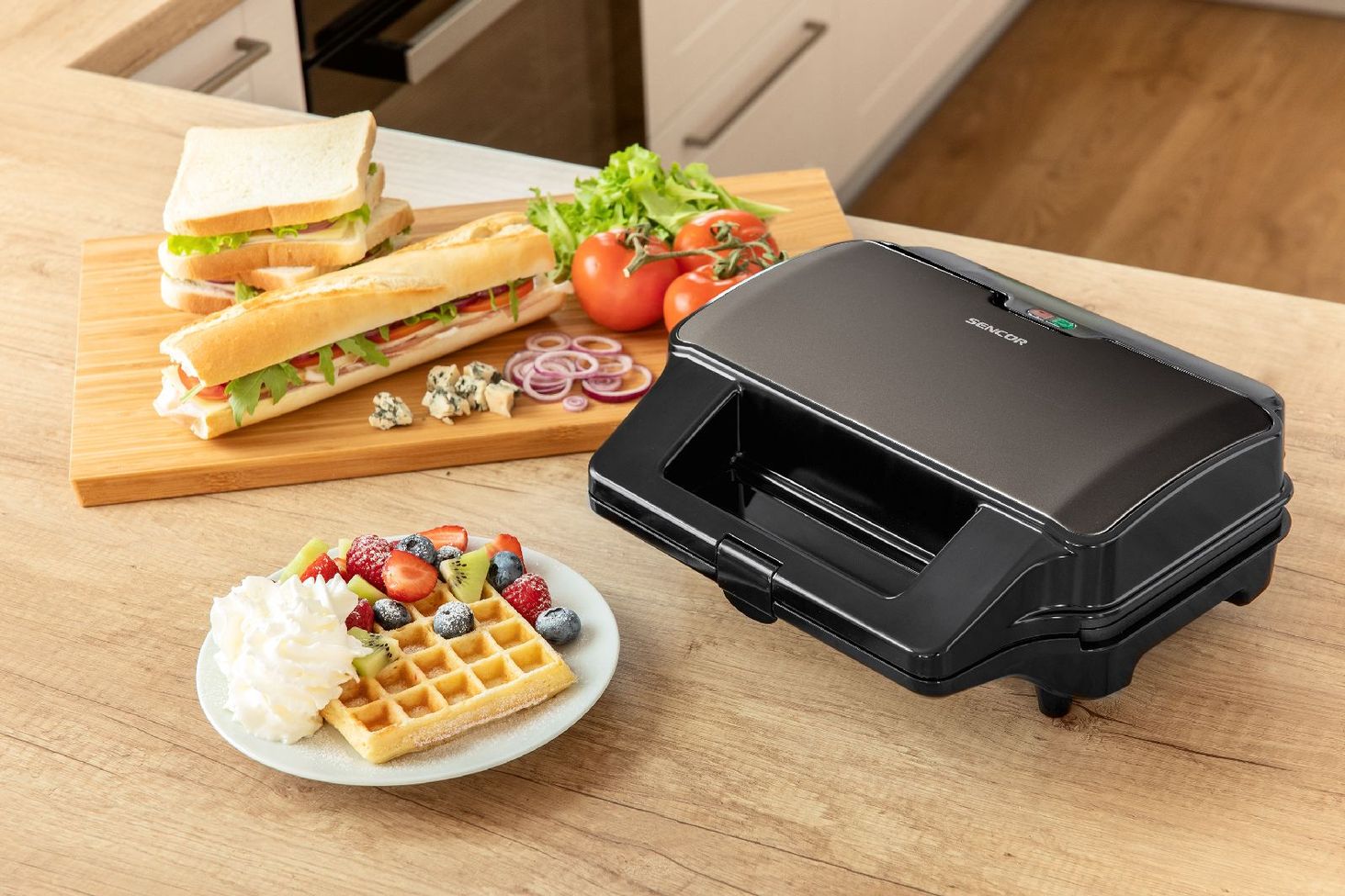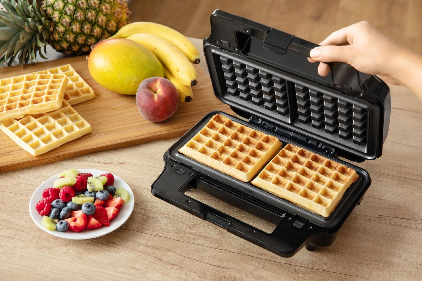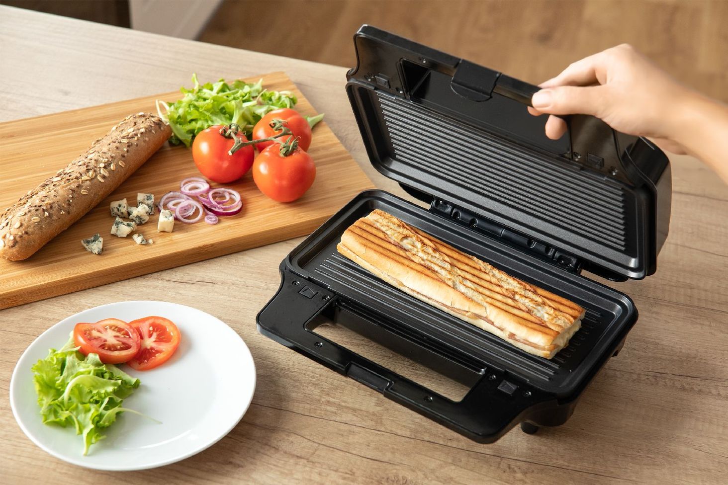 Легкий і смачний сніданок. Використовуйте чотири тарілки для різноманітних сендвічів, вафель і смаження м’яса. Тостер має потужність 900 Вт, що дозволяє швидко випікати, а антипригарне покриття пластин дозволяє легко мити. Керувати тостером легко і безпечно завдяки світловим індикаторам, які інформують про стан пристрою, а термоізольований корпус і ручка запобігають опікам.