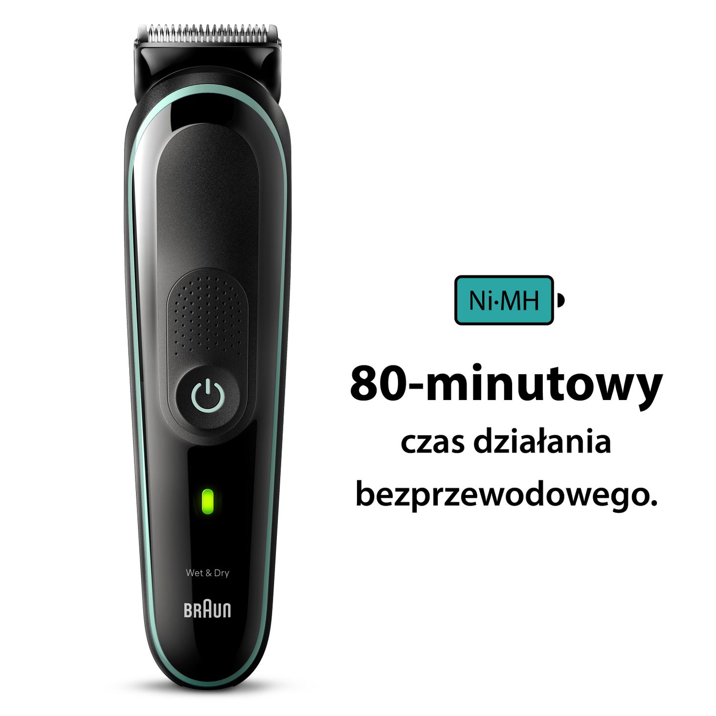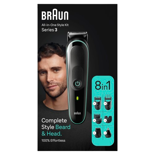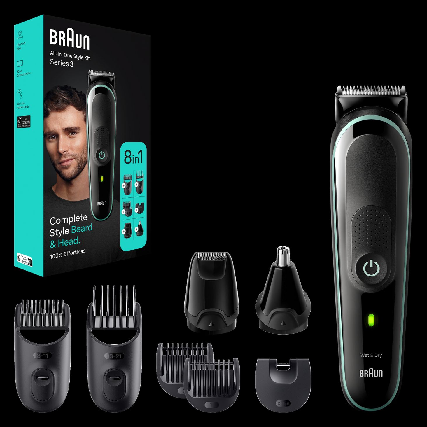 Доглядайте за своєю бородою та обличчям аж до голови за допомогою універсального набору для укладання Braun Series 3. Набір 8-в-1 для догляду за бородою, волоссям, дрібними корекціями тощо. З надгострими лезами та 80-хвилинним часом роботи.